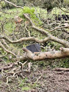 Two mature trees fell to those high winds here. One a Monterey pine about 70/80 years old, and the second was a particularly beautiful old and well established ash tree in which we had placed one of our owl nesting boxes. We are estimating it to have been around 100 years old!